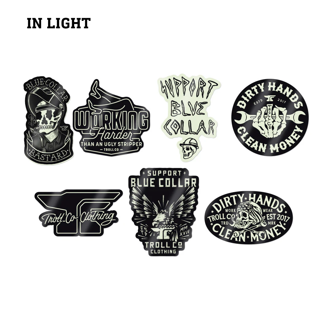 Built for the ones who clock in early, stay late, and don’t need the spotlight to stand out. The Jumbo Glow Pack brings together seven of our hardest hitting designs, all in glow in the dark vinyl that charges up by day and shines at night. Perfect for coolers, toolboxes, hard hats, bumpers, shop walls, and wherever you want that Blue Collar energy to show up after dark.